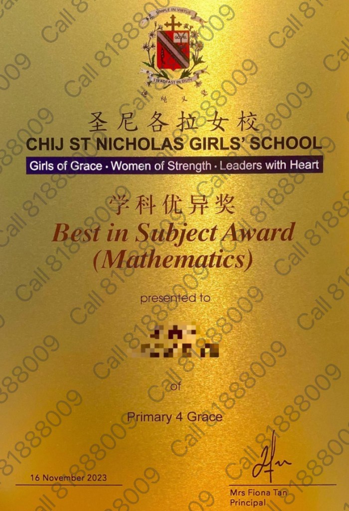 - 2023: P4 BEST IN MATH AWARD [ST. NICHOLAS GIRLS’ SCHOOL]